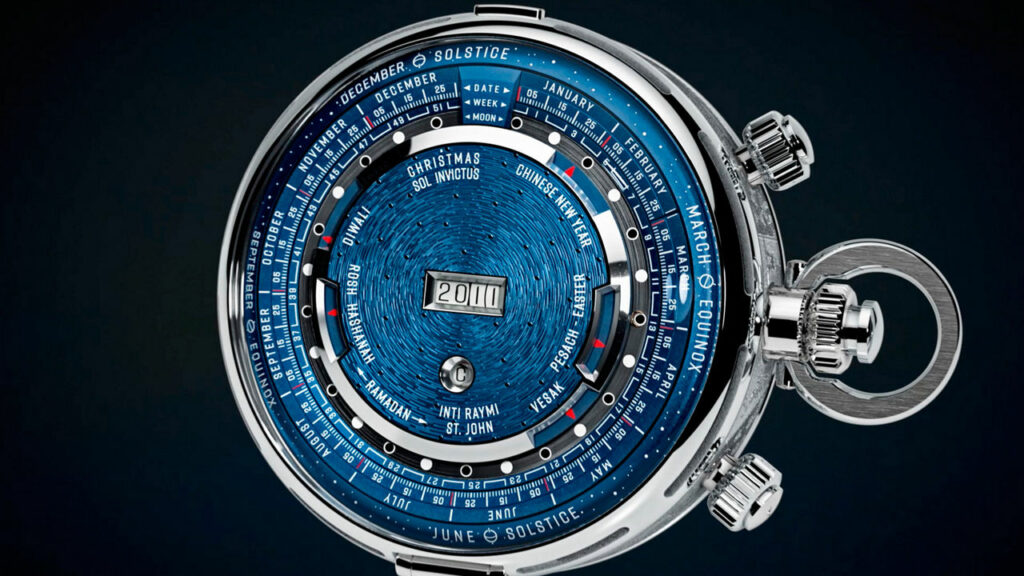 Au dos du boîtier, on aperçoit le Calendrier Universel, un mécanisme lunisolaire auto-synchronisé et indépendant du mouvement principal. Il suit les cycles solaires, lunaires et luni-solaire, affichant solstices, phases de la lune, ainsi que des dates religieuses comme Pâques, Ramadan, le Nouvel An chinois ou Diwali. Ce calculateur mécanique indique 18 repères, et ses indications resteront synchronisées jusqu’en 2099, selon les déclarations de la marque.
