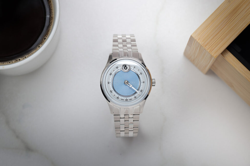 Le boîtier de 39 mm, alternant surfaces brossées et polies, abrite l’association du mouvement Sellita SW200-1 et du module JJ01 sous une glace saphir type « box ». Proposée sur le bracelet acier Consort ou un cuir italien, la montre affiche un positionnement cohérent, avoisinant les 2 975 $ sur cuir et 3 165 $ sur acier. Ce tarif s’applique également à l’édition limitée Dusk Red sur bracelet Consort.